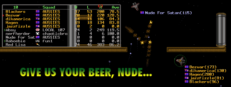 Or at least six AUS$IES anyway! Last night in Alpha we had a huge turn out, as you can tell by the picture. Nude was last on the scene, and couldn't quite squeeze into the freq, even with half a litre of KJ jelly and a copy of his favourite Mill's and Boon novel! So evil Bezwar drove the nasty, laming (hope you all read the guide!) and negging five-Aussie turret in Nude's general direction.. It was not a pretty sight. (I still think we all need the same flag, but personal choice and all...)
