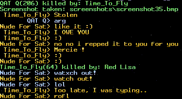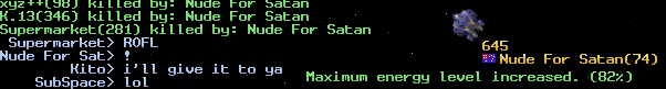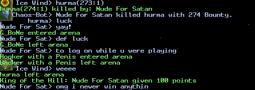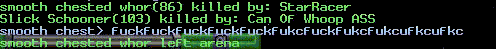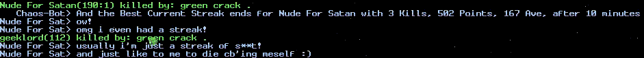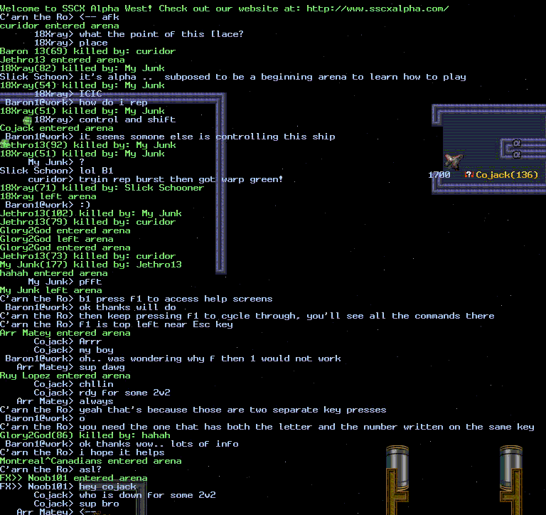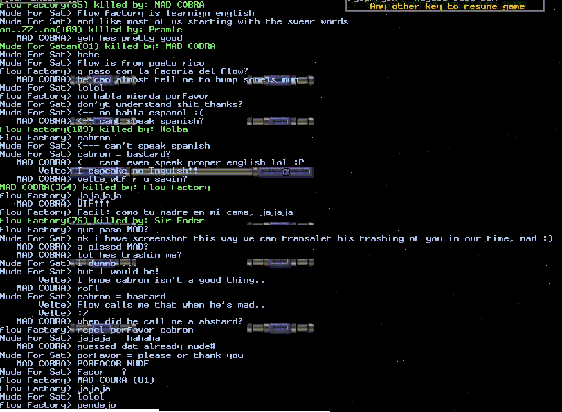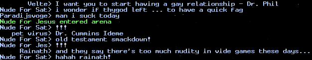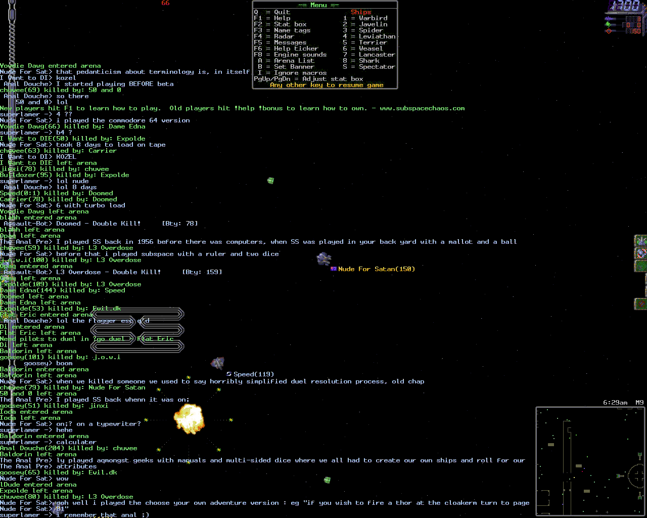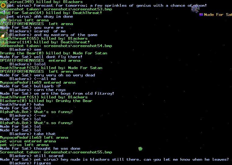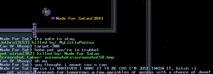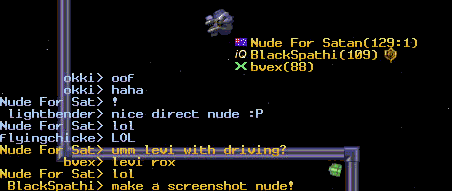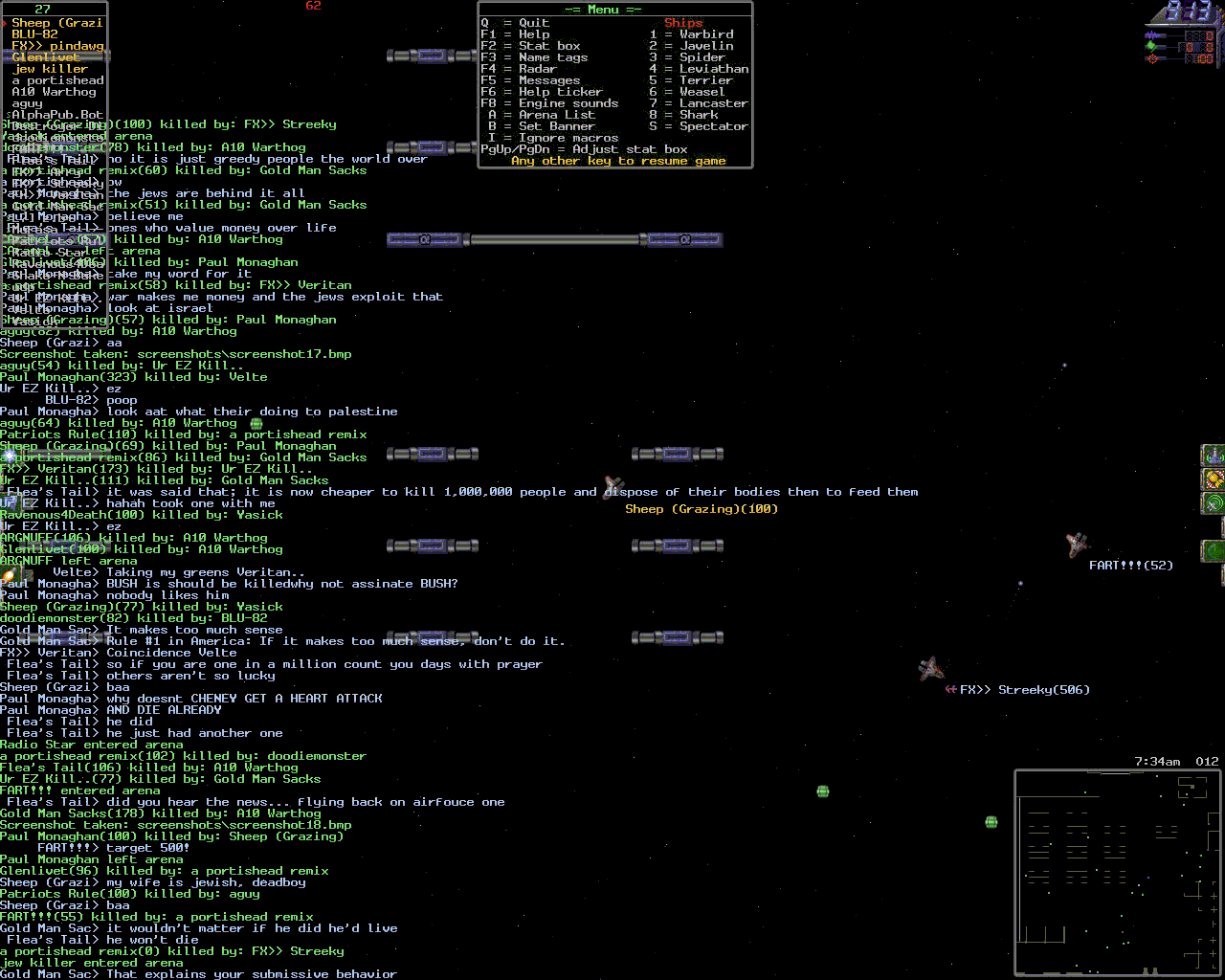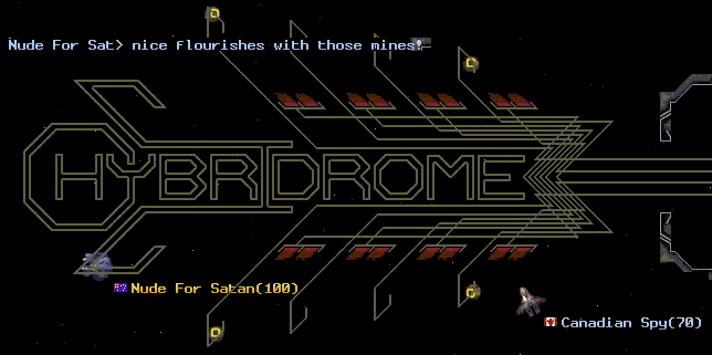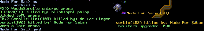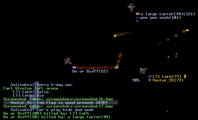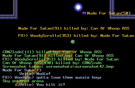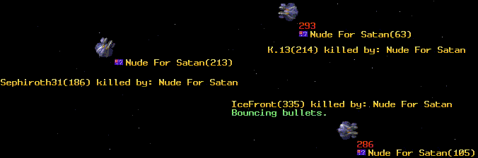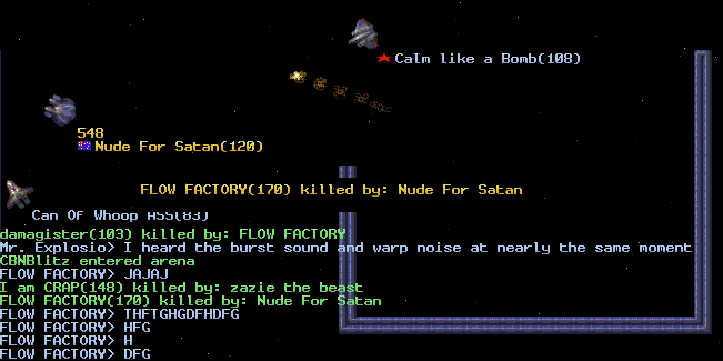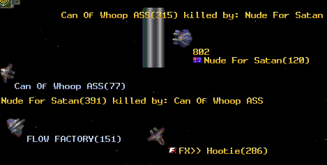 This idiot was levelling abuse at Red Lisa so I thought I'd gut him. Later I ploughed three consecutive ships' bullet streams, the last being this Default feller, who was kind enough to tell me to 'die fagget'. The moral of this story: I spell my trash-talking better than Default does. ![]() |